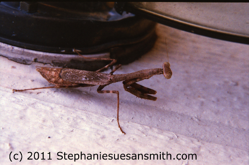 Praying mantids grow to 3-4 inches in length. They are an ambush predator, remaining motionless until prey comes within reach. At that point, they snatch the prey with lightening speed. This looks like the strike of a snake it is so quick.