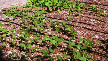 Pole beans are planted in rows but are about 3 feet apart. You hill up the soil and place a stake in the center. Plant 3-4 seeds around the stake, about one inch deep. The beans will naturally wrap around the stake as they grow.