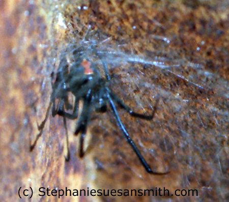This is the black widow spider. Note the shiny appearance and the red hourglass on the lower abdomen. If the spider is fuzzy, it isn’t a black widow. In fact, you will probably never see this spider. She is shy and likes dark places. Potting sheds and the inside of unused spigots are the usual traps for the unwary these days. Once upon a time, they nested in out houses. Not a good thing.